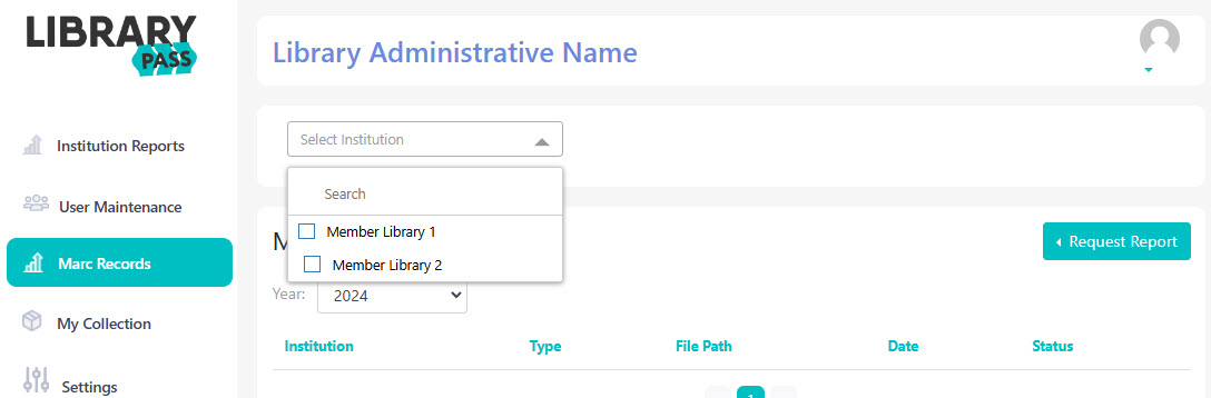 1. In the drop down menu, select the Member Account you would like to pull MARC Records for