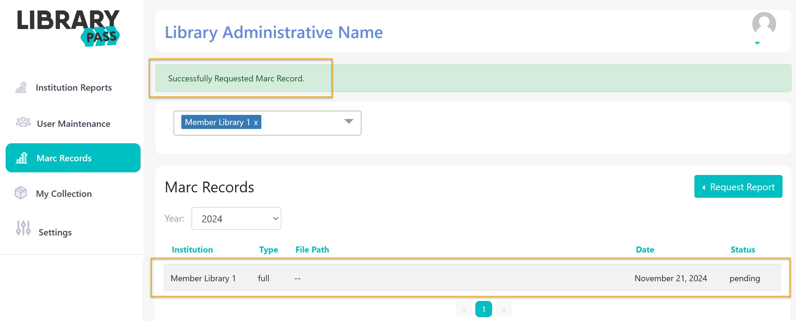 3. Once you request your report, you will a notice that states "Successfully Requested MARC Record", as well as a line item with a status of "pending".
